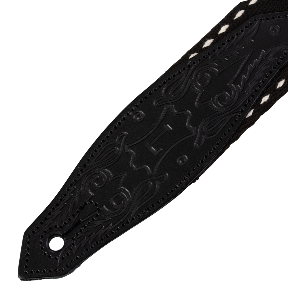 • 2" Black Woven Cotton Guitar Strap With Tooled Veg-Tan Leather Ends.