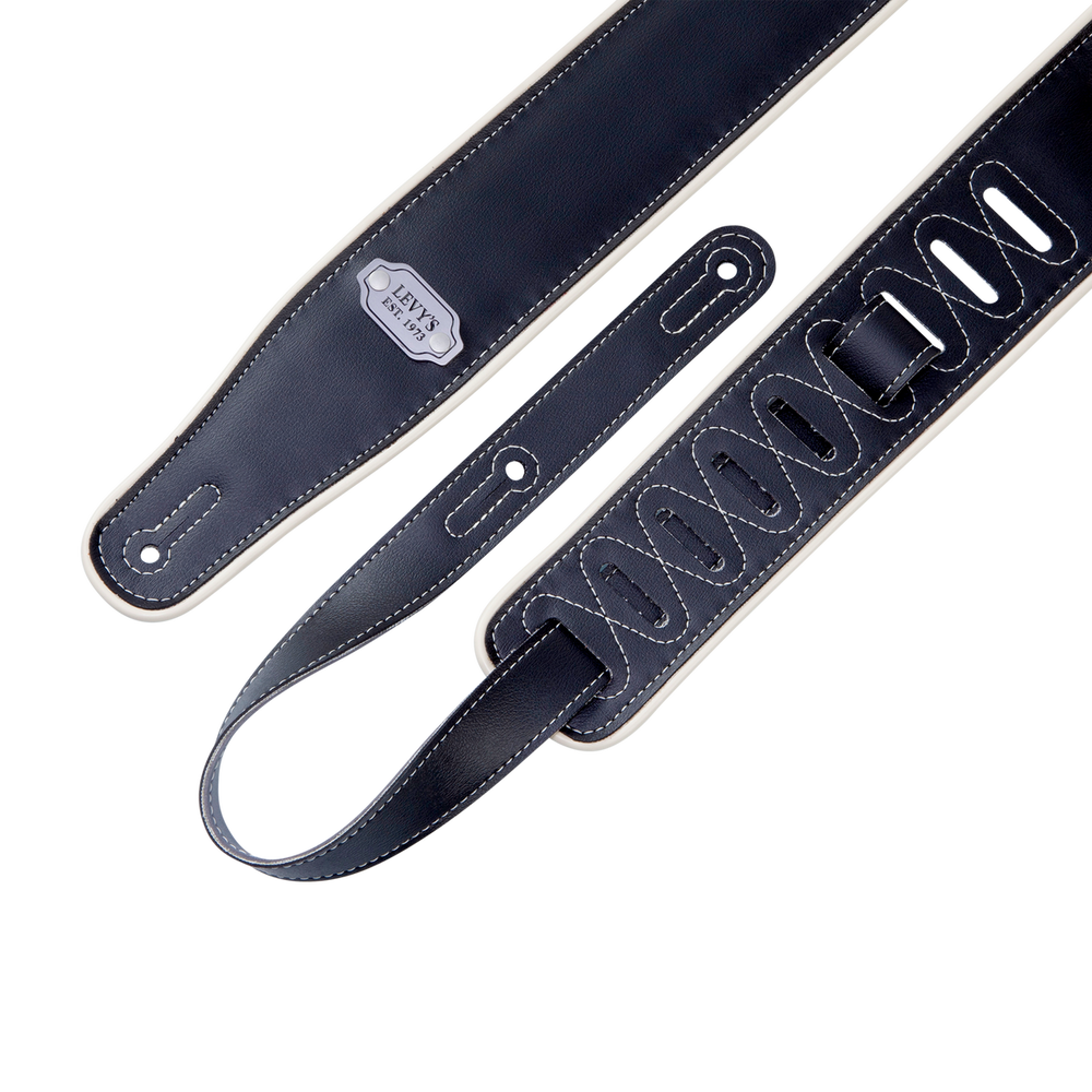 • Two-ply reversible vinyl guitar strap with cream piping and metal dog tag. Padded strap with reinforced cream stitching