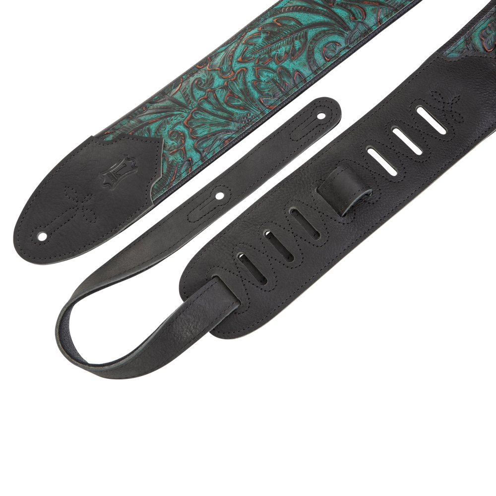 • Two-ply embossed leather guitar strap with supple padding and garment leather backing. Features Western end tabs with floret stitched detail and light bronze foil. Adjustable from 37" to 52".